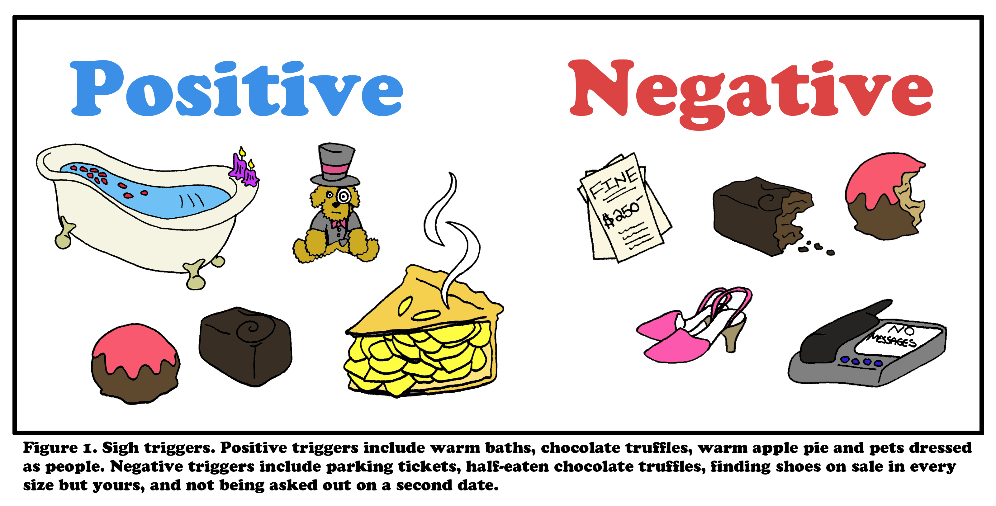 The “double sigh” is a very advanced technique and should only be attempted by experts like Madeleine – for our purposes, a single sigh should suffice. Sighs are typically generated by either positive or negative triggers (see figure 1). Positive triggers include warm baths, chocolate, back rubs or very attractive people. Negative triggers include anger, parking tickets, social injustice, or commercials showing starving children or abused pets.