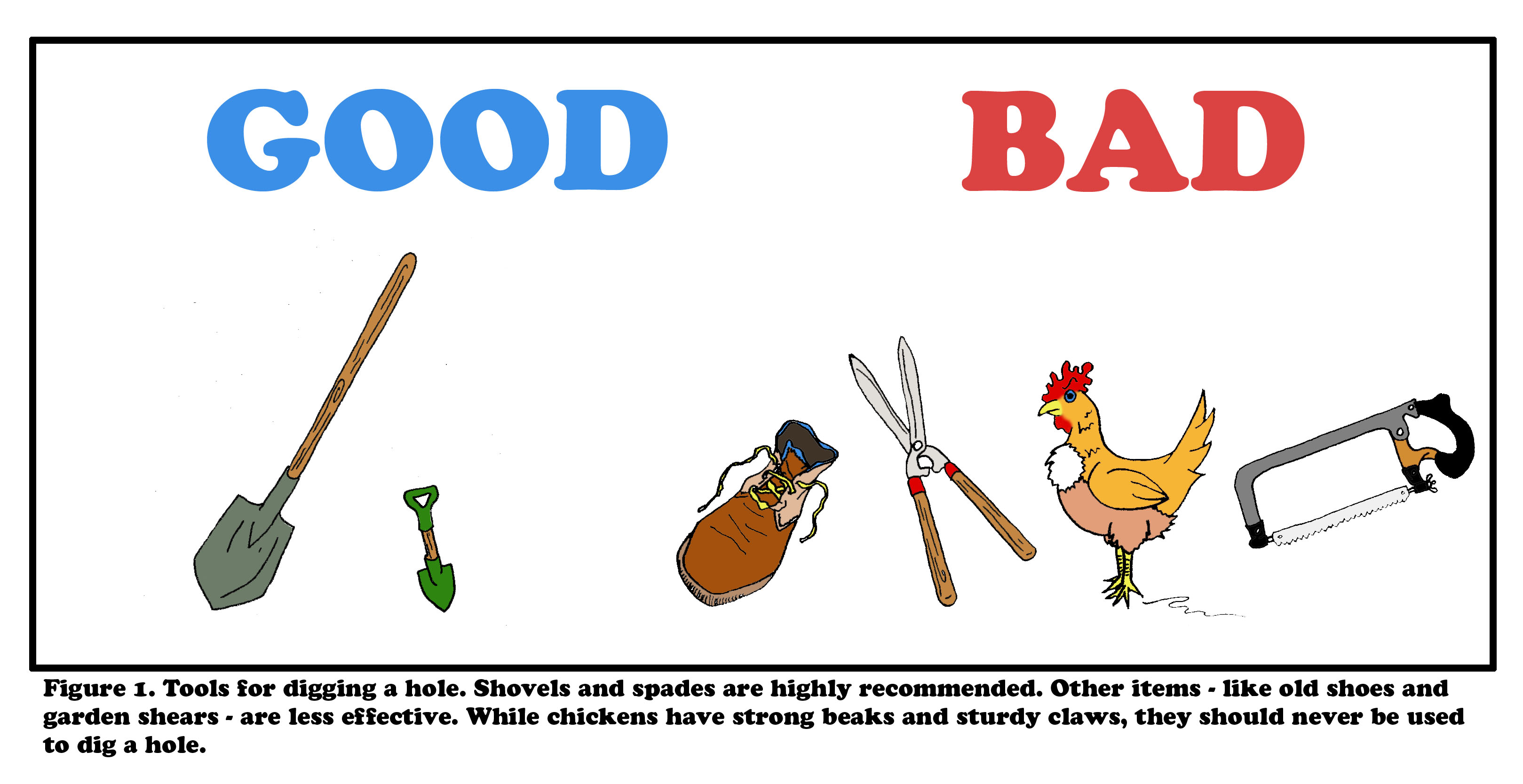 Expert advice – for as Chester implied, one of the biggest mistakes in hole digging is grabbing the wrong tool for the job (see Figure 1). Depending on the size of the hole, garden spades and the standard issue shovel are the ideal choices for digging a hole. Other garden tools – like hedge shears and hacksaws – are not as effective. Using your hand is also not recommended – especially if you’re fond of intact skin.