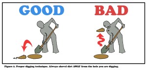 Before digging, it’s important to understand the physics of your hole. Remember Bernoulli’s Principle and Coulomb’s Law? Well I don’t. But I do remember something called the conservation of dirt: simply put, whatever you dig out has to go somewhere – if it goes back into the hole you’re digging, then you’ll never make any progress. Always shovel the dirt to the side – or over the shoulder if you’re of a more dramatic predisposition (see Figure 2).